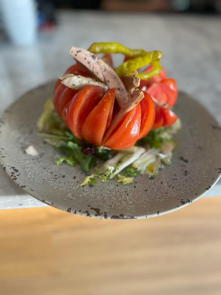 Tomate, mozzarella, calabacin, berenjena, pimientos y pesto de albahaca