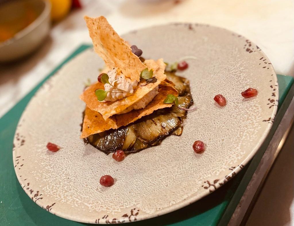 Flor de alcachofas, con mousse de Salmon, y pan carasau de cardeña y granada