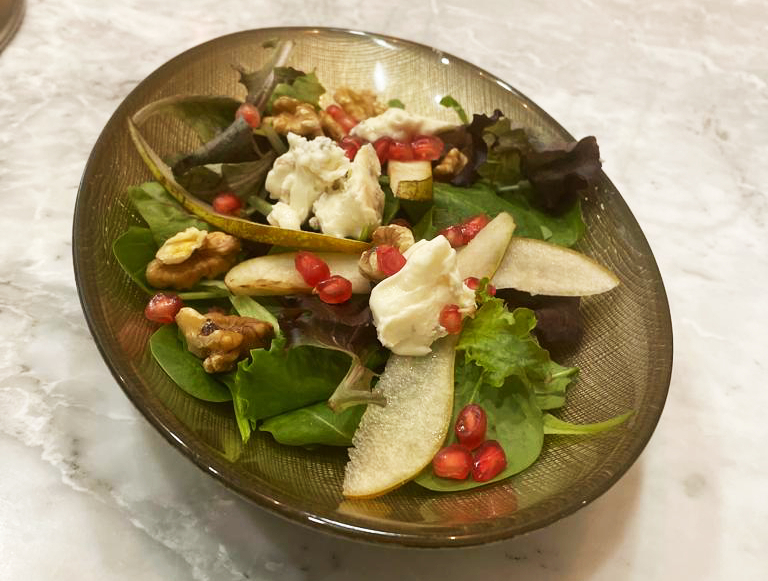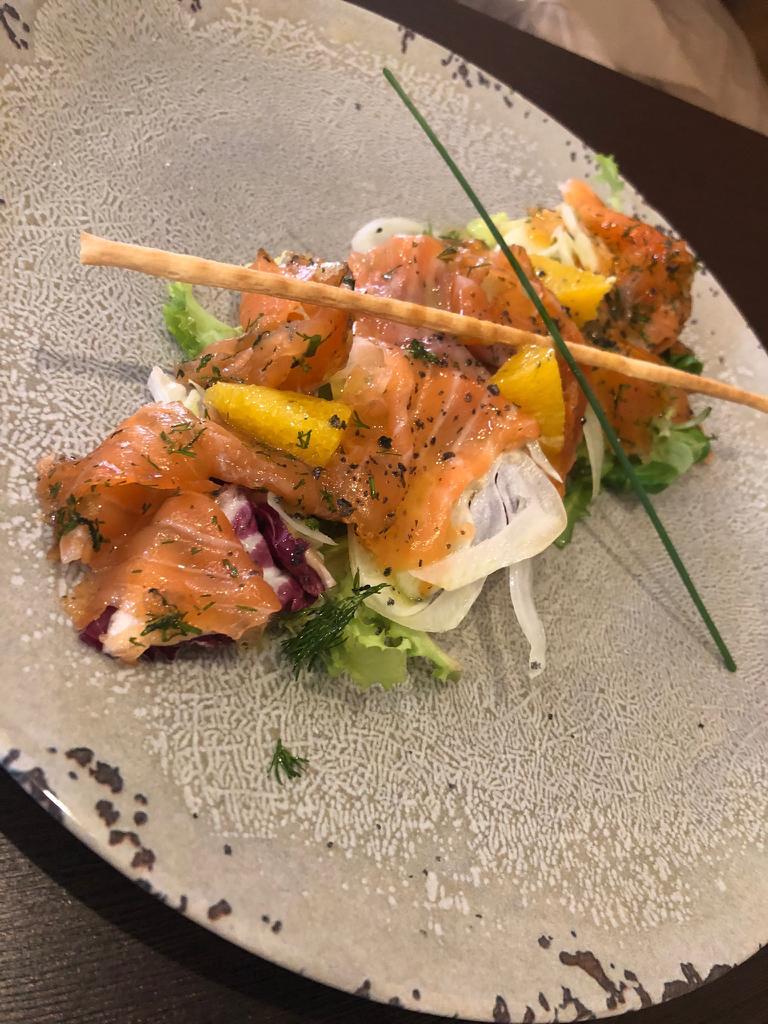 Carpaccio de salmón marinado hinojo silvestre y mezclum de lechuga y pan italiano