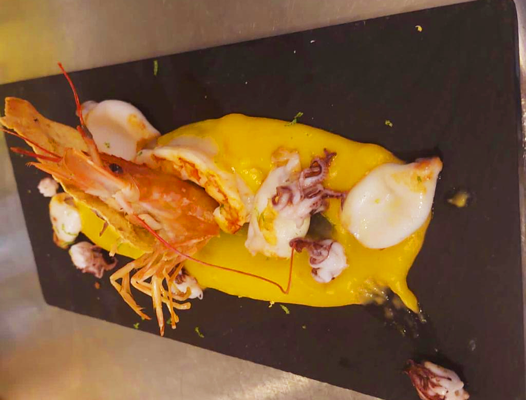 Chipirones y gambon a la plancha con crema de zanahoria y lime, y rallada de Limón