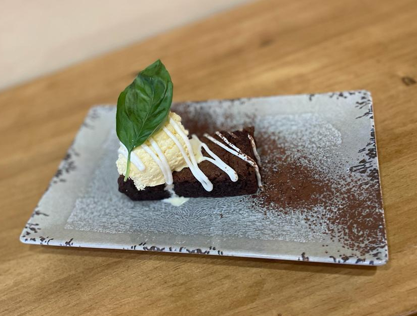 Brownie casero con helado de vainilla, y toque de albahaca