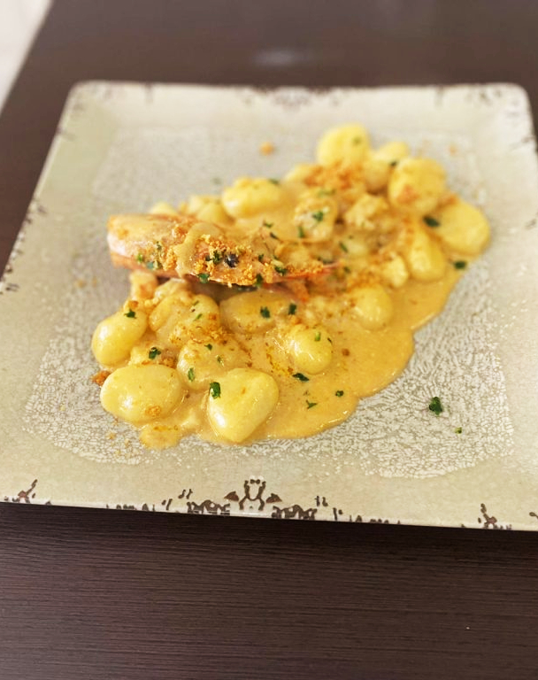 Gnocchi con crema de crustáceos y pan tostado