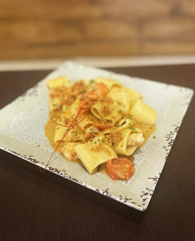 Paccheri con crema de crustáceos y langostinos en plancha